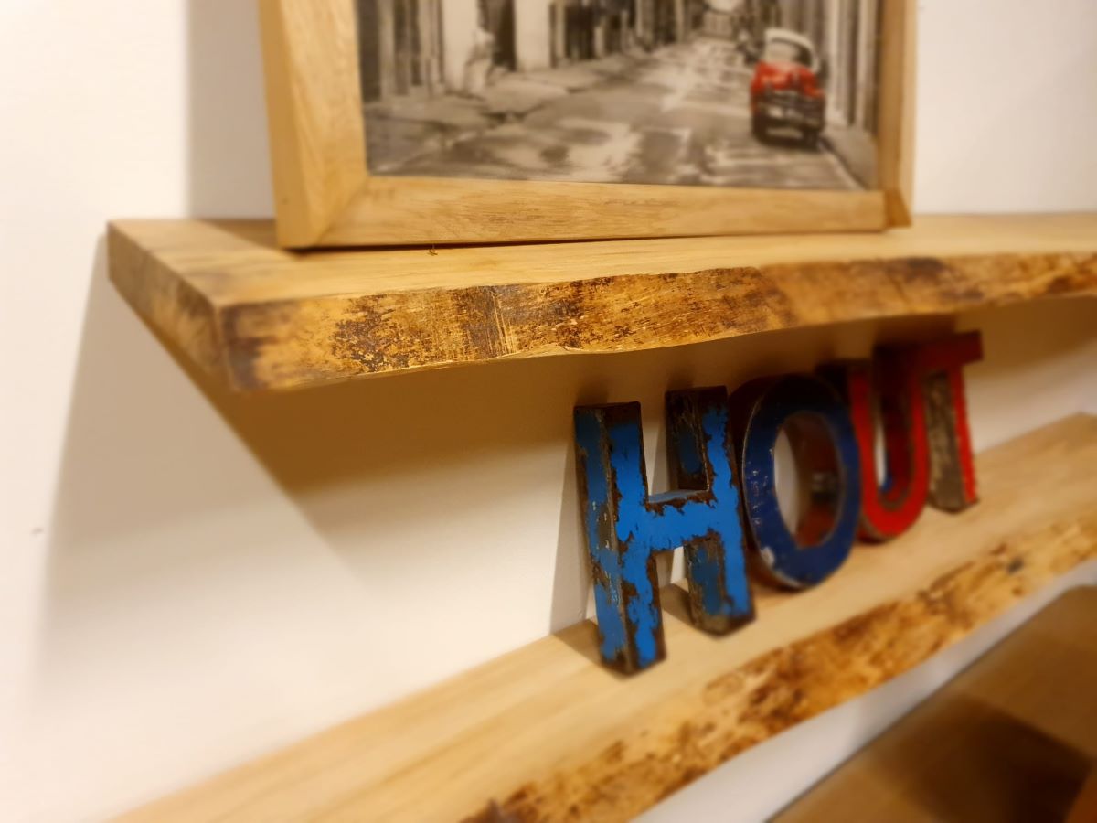 Bij Woodindustries maken wij onze Elmwood wandplank 30cm diep en 6cm dik in eigen werkplaats. Deze boomstamplank maken wij op maat. De plank is geschuurd en behandeld met een beschermende laag. Deze laag beschermt tegen kringen en krassen. De plank is gemaakt met een voorbereiding voor blinde bevestiging.